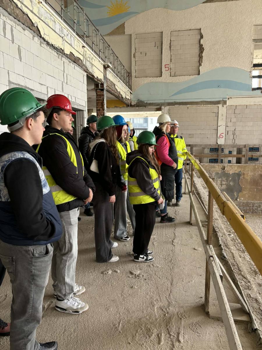 30 marca br. grupa uczniów klasy 4TB pojechała do Leszna. Celem wyjazdu była analiza prac budowlanych w leszczyńskiej pływalni Akwawit. Pod przewodnictwem kierownika budowy pana Arkadiusza Majorczyka z przedsiębiorstwa Adamietz uczniowie mieli okazję zobaczyć wszystkie najważniejsze punkty modernizowanego obiektu. Początek zwiedzania rozpoczął się od miejsc, gdzie w niedługim czasie zostaną zamontowane przewody, niecki basenowe, jaccuzi, sauny, groty solne, a także plaże, szatnie oraz pomieszczenia administracyjne. Najciekawszym elementem okazały się słupy i miejsca, gdzie wznoszą się na nowo dwie zjeżdżalnie rekreacyjne. Pan Arkadiusz opowiedział o badaniach materiałów, jakie się odbywały przy sprawdzeniu przydatności na etapie modernizacji. Zwrócił także uwagę na innowacyjne rozwiązania lekkiej konstrukcji dachu. Planowany termin zakończenia prac to czerwiec przyszłego roku. Dla młodzieży był to dzień niezapomnianej, praktycznej lekcji zawodu.