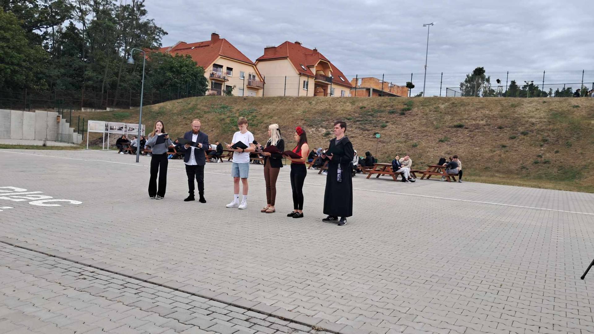 W dniu dzisiejszym uczniowie klas 5tz, 3tlg i 3tel zaprezentowali zebranym na boisku scenkę o polskim uczniu Piotrze. Do Piotra dzwonią przyjaciele z Niemiec, Francji, Hiszpanii i Wielkiej Brytanii, zapraszają go do siebie, bo świetnie mówi po niemiecku, francusku, hiszpańsku i angielsku. Umiejętności językowe w dzisiejszej Europie bez granic są bardzo ważne. Warto się uczyć języków, aby się porozumieć, znaleźć dobrą pracę, aby podróżować po Europie i świecie.